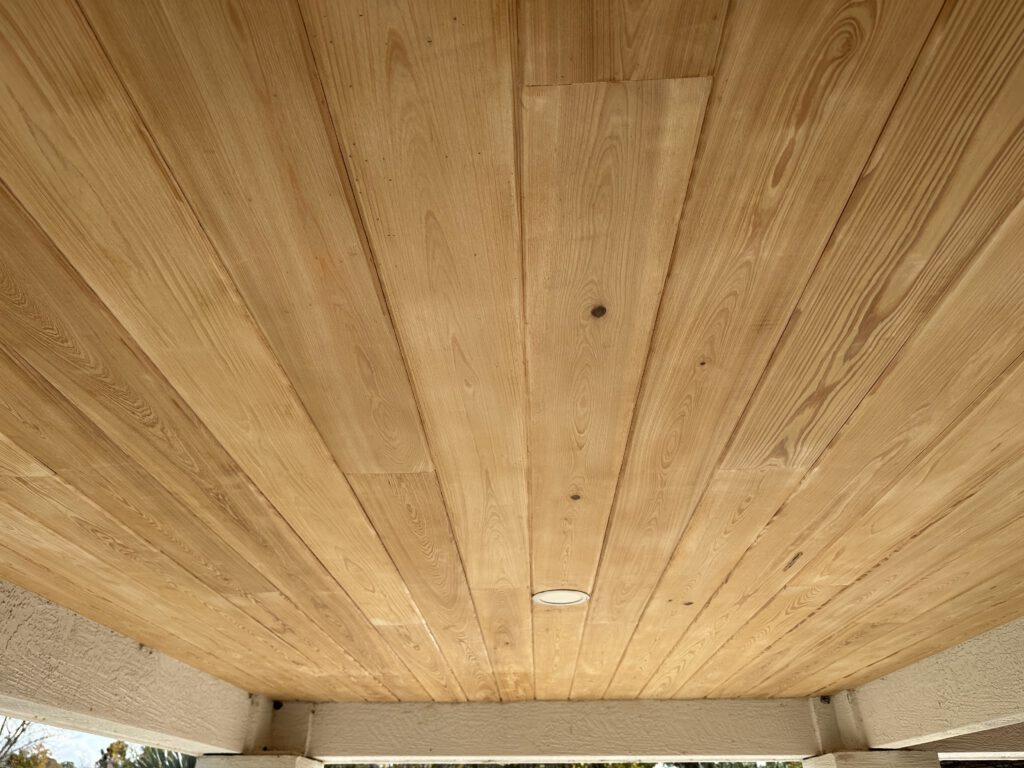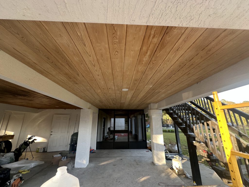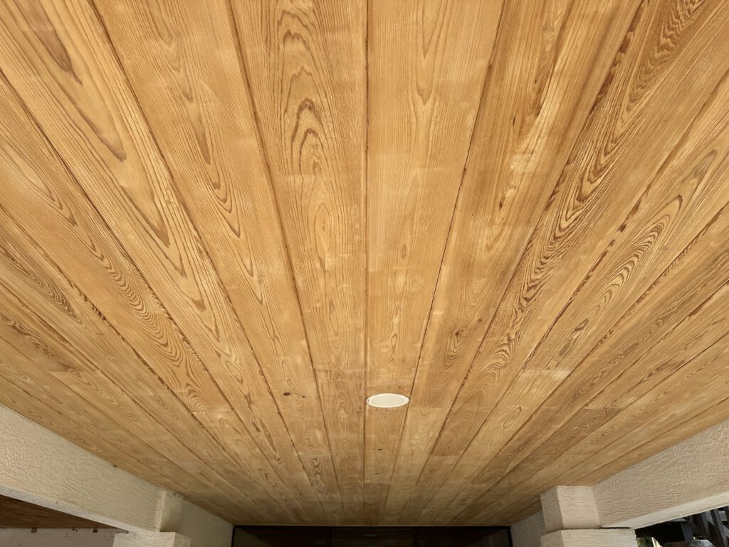 The result is a refreshed, durable ceiling with rich, warm wood tones that enhances the curb appeal of the home and provides long-lasting protection for this outdoor space.