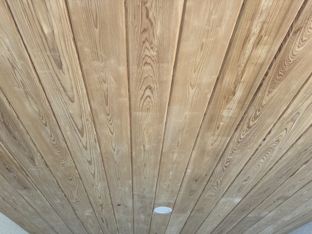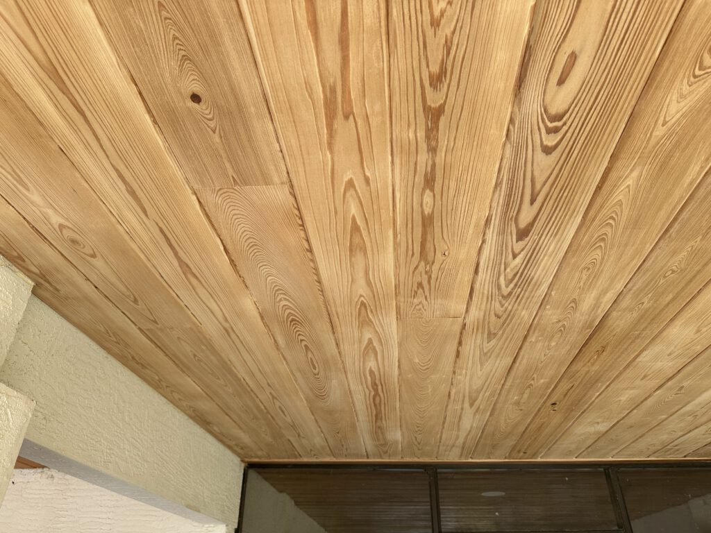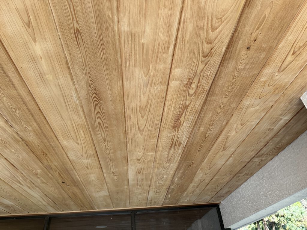 After years of exposure to the elements, the exterior ceiling wood over this entry had begun to show significant wear, discoloration, and minor surface damage. Our team carefully inspected the existing material, removed deteriorated sections, and repaired damaged areas to restore a solid, uniform surface.